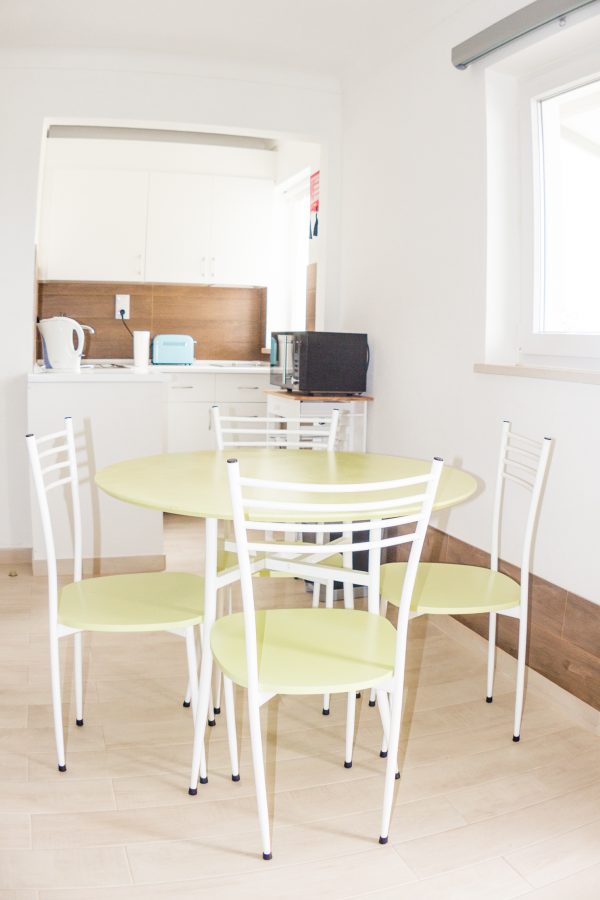 • Kitchenette equipada com frigorífico, placa elétrica, micro-ondas, exaustor, loiça e talheres