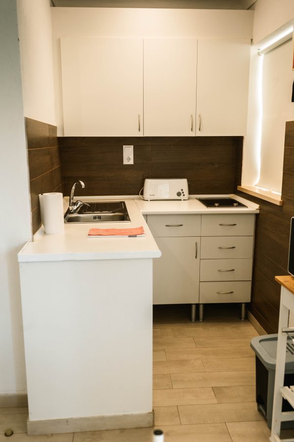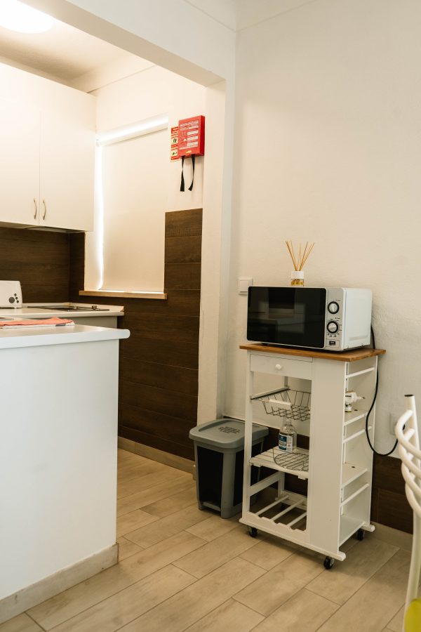 Kitchenette equipada com frigorífico, placa elétrica, micro-ondas, exaustor, loiça e talheres