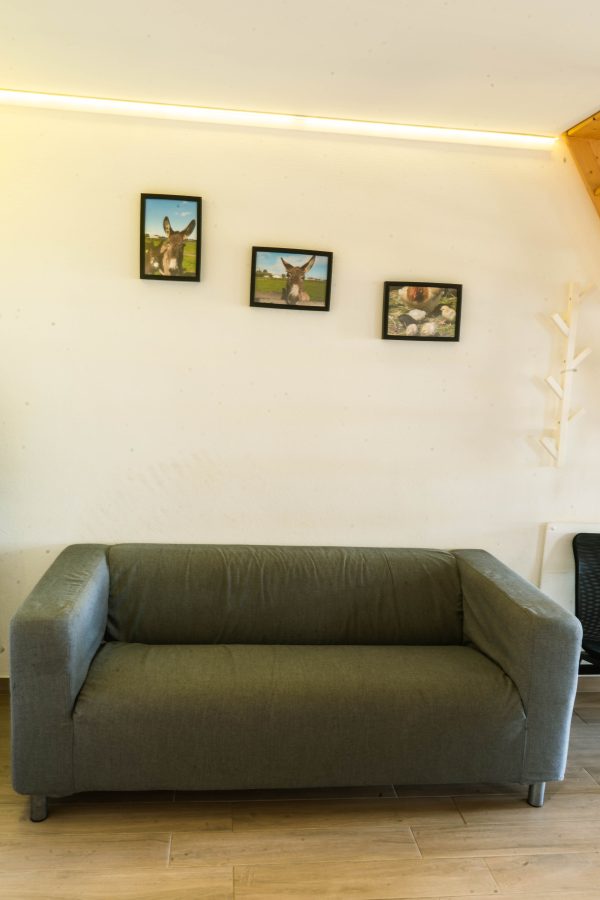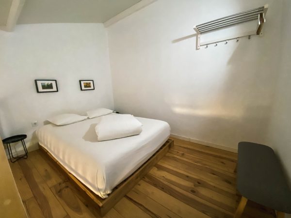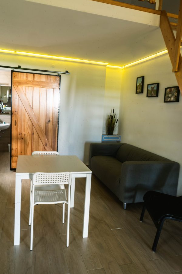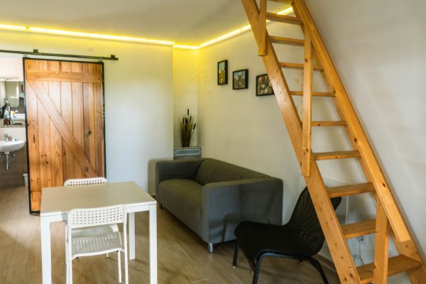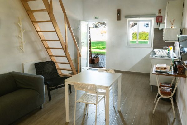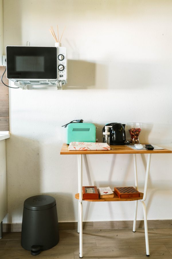 Kitchenette equipada com frigorífico, placa elétrica, micro-ondas, exaustor, loiça e talheres